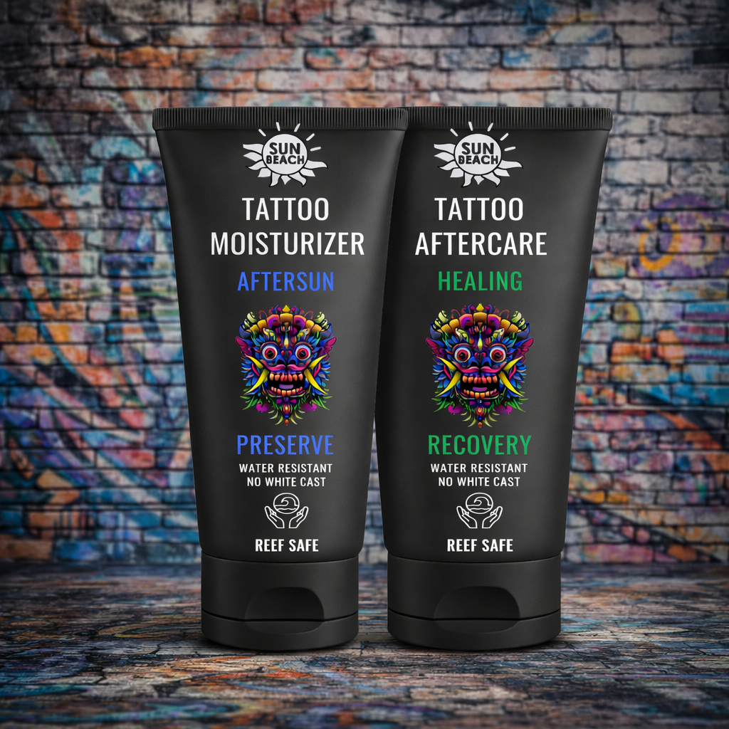 The Tattoo Care Collective Aftersun + Aftercare Recovery Duo Kit is formulated to support tattooed skin during and after the healing phase. The Aftersun / Daily Moisturiser helps restore hydration, calm sun-exposed skin, and maintain skin barrier function, supporting overall skin balance. The Aftercare Recovery Lotion is designed specifically for new and healing tattoos, helping reduce irritation, support skin repair, and allow pigment to settle correctly. Used together, this system provides structured recovery and ongoing care to support optimal healing and long-term tattoo quality.